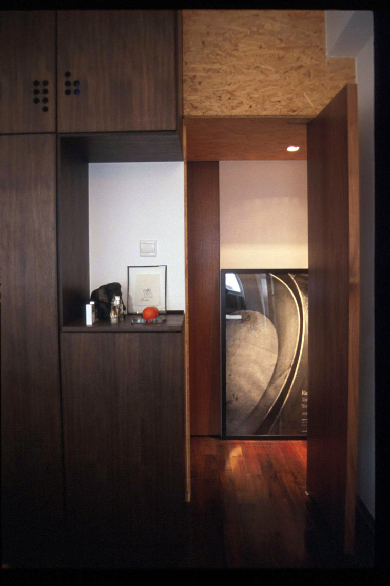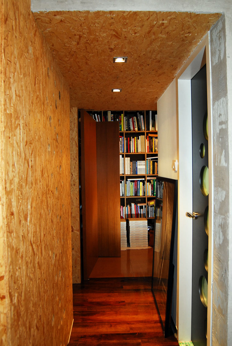 2) The OSB Spine wall also houses functions along its length: It is a wine rack, a shoes cabinet, a small table, a linen closet, a storage…you can see the spine in every room of the apartment.